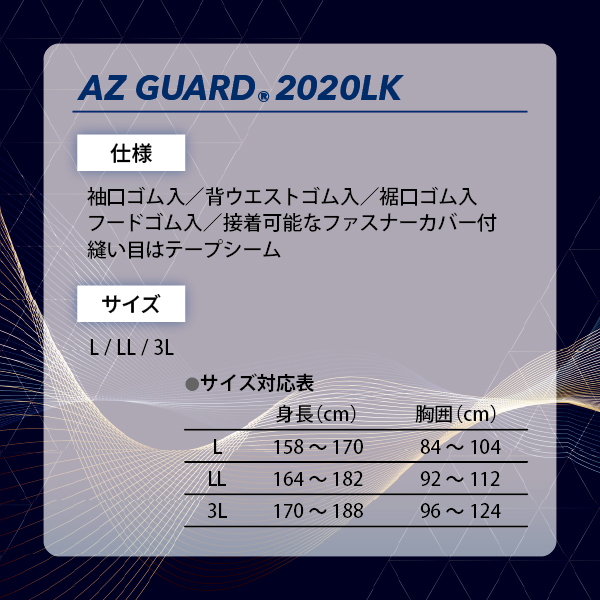 | サイズ詳細 | 【L】身長 158-170cm/胸囲 84-104cm 【LL】身長 164-182cm/胸囲 92-112cm 【3L】身長 170-188cm/胸囲 96-124cm |