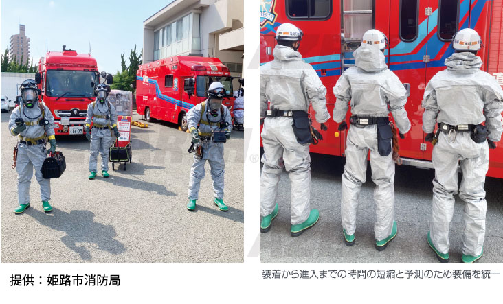 当局における化学災害に対応する資機材は、主として本部高度救助隊が保有し、同隊が特殊災害を担当しており、全市対応の体制を取っています。本部高度救助隊は、タイケム®6000Fを含む化学災害に対応するレベルに応じた防護服を保有しており、特別救助隊とともに最前線での活動を想定した防護服を数種類備えています。