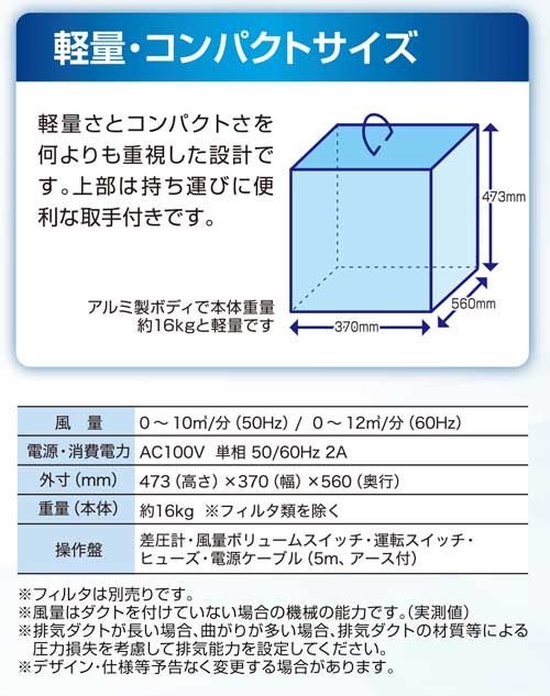 風量0~10㎥/分(50Hz時)/~12㎥/分(60Hz時)の排気能力を持ちながら、高さ473mm×幅370mm×奥行560㎜(うちダクト部分50㎜)、本体重量約16kgというコンパクトサイズで狭いスペースへの移動・設置が容易です。